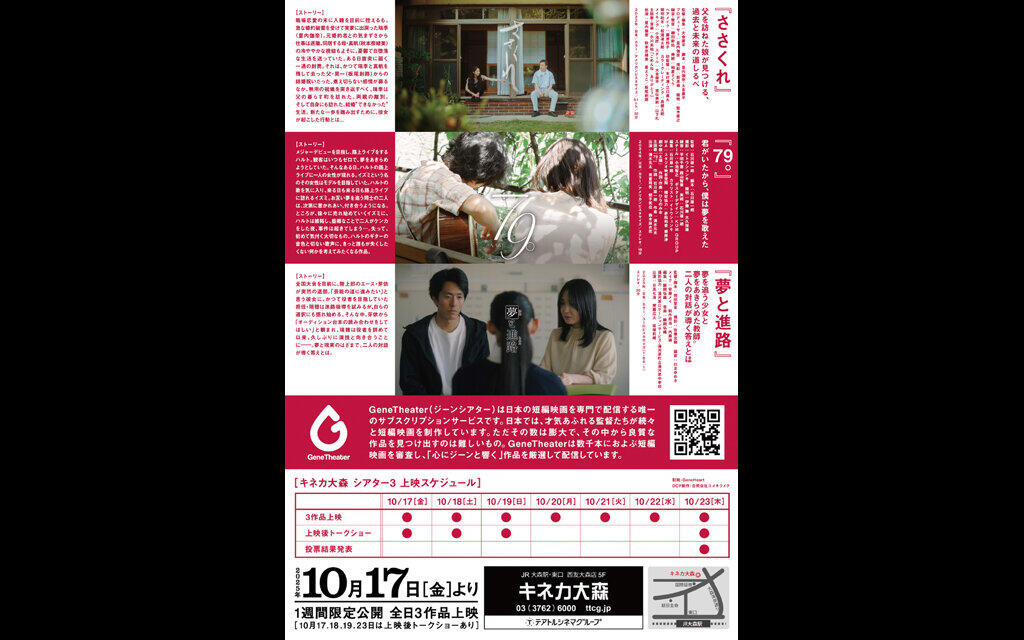 「ジーンシアタースタジアム」では、インディーズ短編映画3作品をひとつのプログラムとして編成し、キネカ大森シアター3(39席)にて1週間の興行を実施。観客動員数や作品評価に応じて、より多くの座席数を有するキネカ大森シアター2(68席)での上映へとステップアップしていく仕組みです。