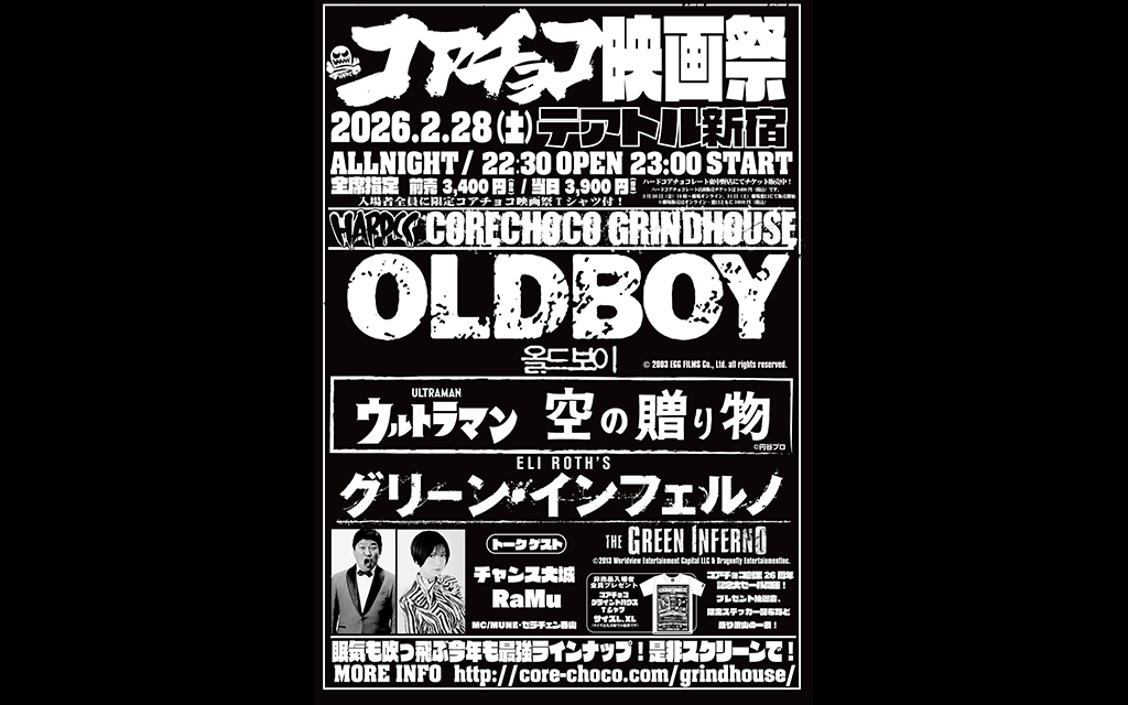 唯一無二のデザインで、映画のみならずプロレス、ゲーム、アニメ・マンガ、特撮、お笑い、音楽、企業コラボなど、もはやメインカルチャーをも掻き乱しているハードコアチョコレートがお届けする新年の風物詩!来たる2026年2月28日(土)、テアトル新宿にて開催が決定!今年のコアチョコ映画祭も眠気吹っ飛ぶ最強ラインナップ!『オールドボーイ』に『ウルトラマン第34話「空の贈り物」』、そして『グリーンインフェルノ』!コアチョコ代表・MUNE厳選、名作三本立て!朝までスクリーンで映画漬け!