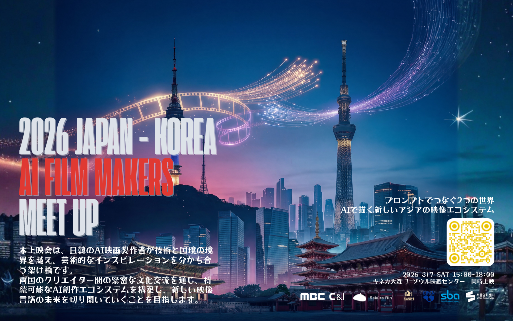生成AIで映像を作る人間が増えている。だが、これまである程度一貫した長尺作品の制作には、生成精度とコストのバランスにより、多少なりとも難しさがあった。そんな中、ここ半年における動画生成AIの進歩は目覚ましく、一貫性はさることながら、文脈理解や感情理解が大幅に向上。それらの動画生成AIをの技術を駆使し、観た人間の感情を動かす「映像作品」として成立させれるのか ---- AI映像に携わるクリエイター達は、このシンギュラリティの中、その1点を見つめてきた。 そして彼らは、AIをもちいた「映像作品」の制作まで、あと半歩 というところまで技術が進歩している事を体感している。2026年----おそらく AI映像の元年と呼ぶにふさわしい年であり、今こそが、その歴史的転換点とも言える。 本交流祭では、日本4作品・韓国4作品、計8本のAI映画を上映。 いずれも、生成AIを自分の表現を拡張するために使いこなしたクリエイターたちの作品だ。上映後には日韓クリエイターによる リモート座談会を実施し、AI映画の現在地と未来を語り合う。 主催は韓国MBC C&I(韓国文化放送グループ)と株式会社Sakura Rin。 STUDIO異次元協力のもと、日韓を主軸にアジアのAI映画文化基盤を 築く長期構想の第一歩として開催する。