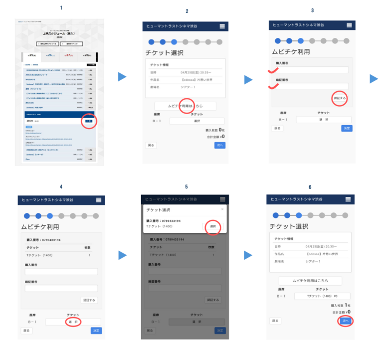 劇場スタッフにご希望の作品名・上映日時をお伝えいただくとともに、お手元のチケットに記載された「購入番号(10桁)」「暗証番号(4桁)」もしくはQRコードをご提示ください