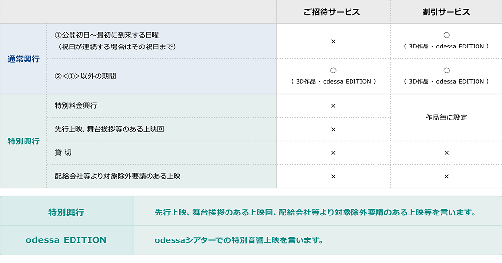 ※ご招待サービスでは「映画ご招待券」1枚で1名様が1回無料で映画をご鑑賞いただけます。3D・odessa EDITIONにつきましては追加料金のご負担でご鑑賞いただけます。