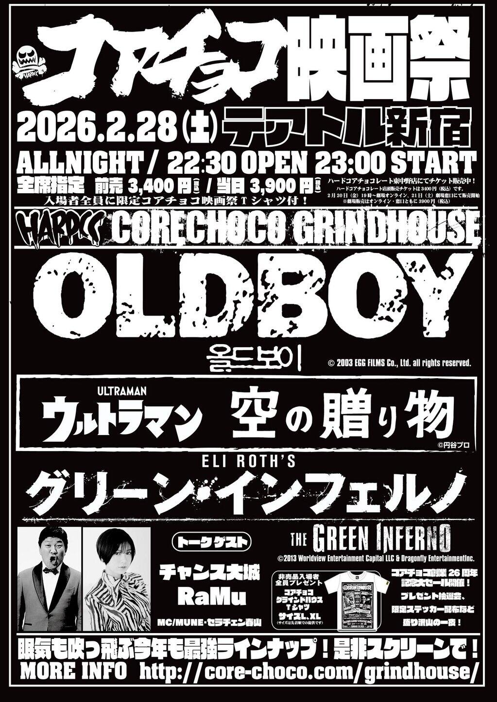 唯一無二のデザインで、映画のみならずプロレス、ゲーム、アニメ・マンガ、特撮、お笑い、音楽、企業コラボなど、もはやメインカルチャーをも掻き乱しているハードコアチョコレートがお届けする新年の風物詩!来たる2026年2月28日(土)、テアトル新宿にて開催が決定!今年のコアチョコ映画祭も眠気吹っ飛ぶ最強ラインナップ!『オールドボーイ』に『ウルトラマン第34話「空の贈り物」』、そして『グリーンインフェルノ』!コアチョコ代表・MUNE厳選、名作三本立て!朝までスクリーンで映画漬け!