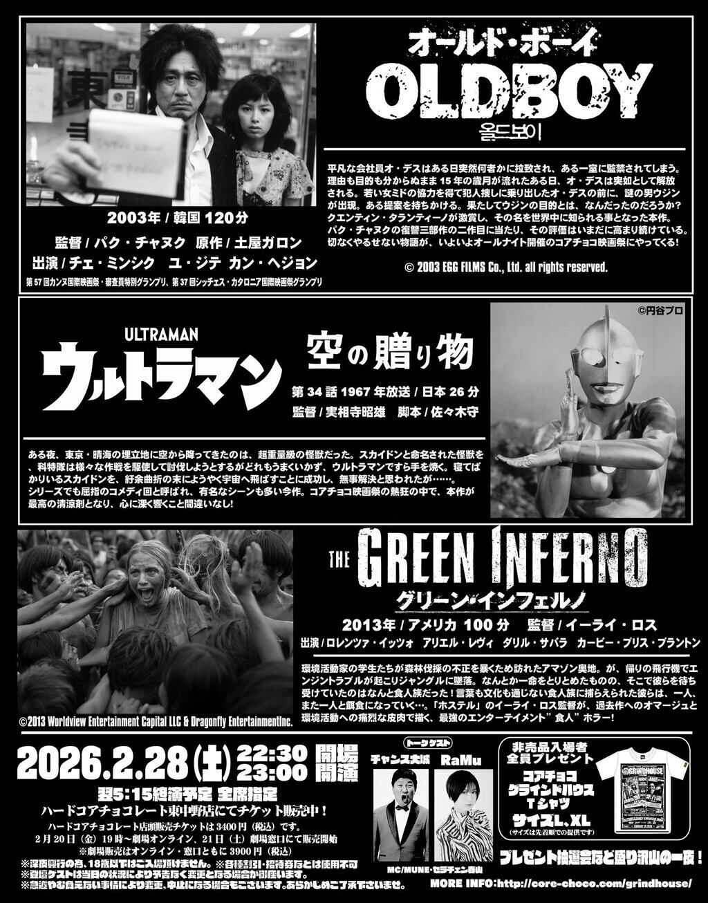 唯一無二のデザインで、映画のみならずプロレス、ゲーム、アニメ・マンガ、特撮、お笑い、音楽、企業コラボなど、もはやメインカルチャーをも掻き乱しているハードコアチョコレートがお届けする新年の風物詩!来たる2026年2月28日(土)、テアトル新宿にて開催が決定!今年のコアチョコ映画祭も眠気吹っ飛ぶ最強ラインナップ!『オールドボーイ』に『ウルトラマン第34話「空の贈り物」』、そして『グリーンインフェルノ』!コアチョコ代表・MUNE厳選、名作三本立て!朝までスクリーンで映画漬け!